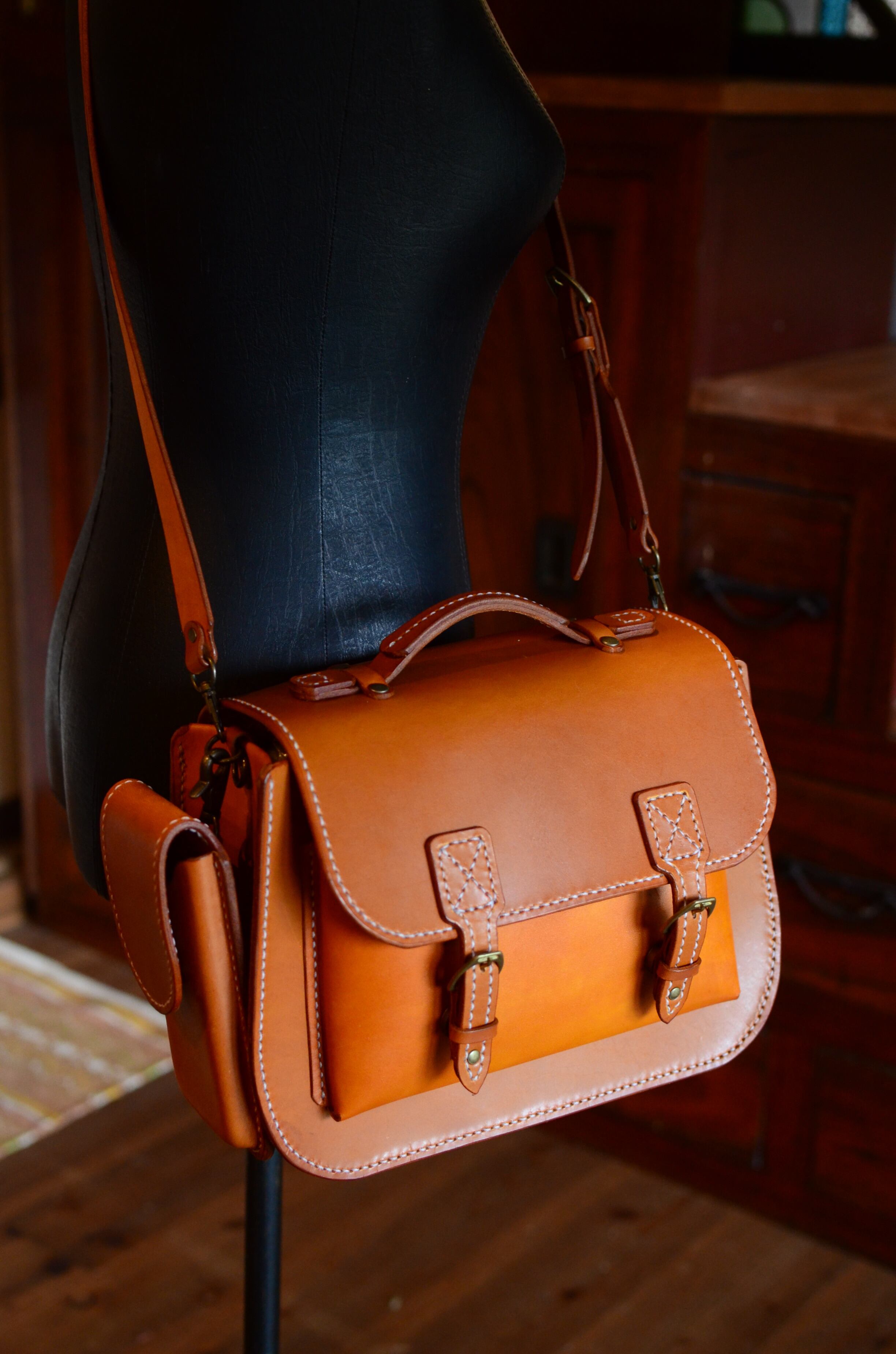 アメリカンオイルレザー使用の手縫いバッグです。 ハンドバッグとして、またショルダーバッグとしての2つの機能を備え、サイドには取り外しのできるスマホホルダーが付属します。