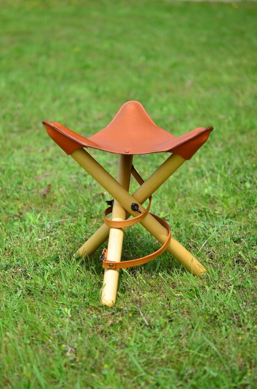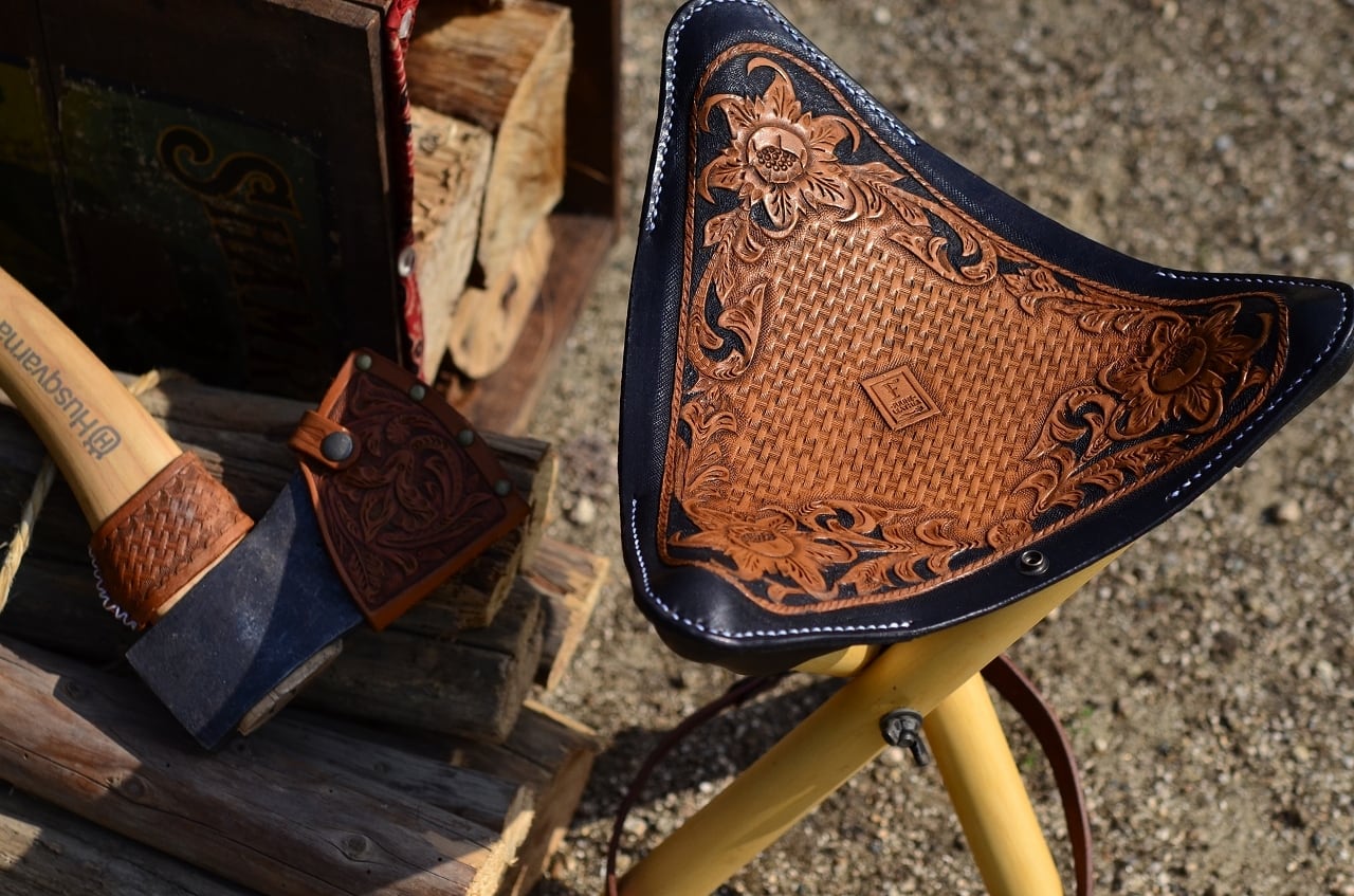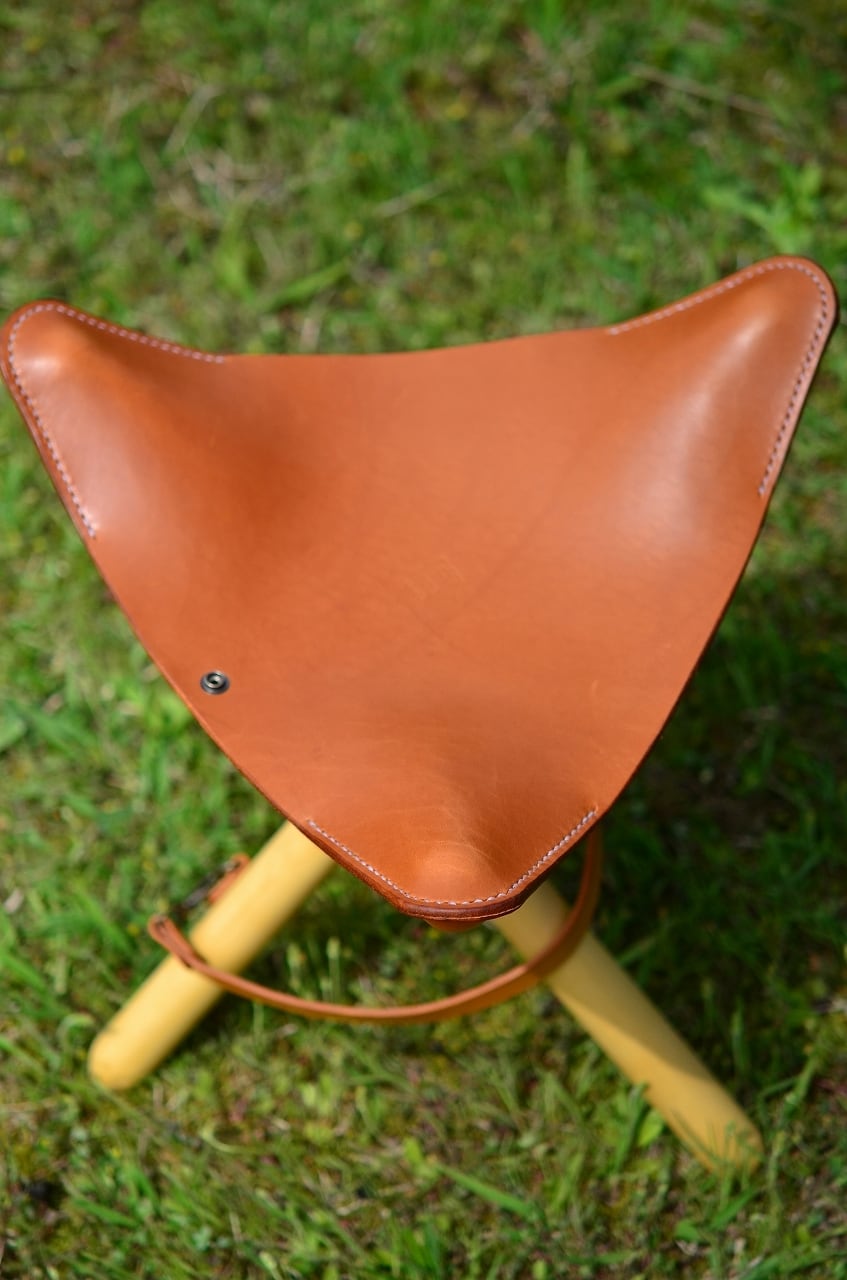 3本の丸木を手作りの専用金具を用いて三又にひらき、革を張ることでチェアに。
