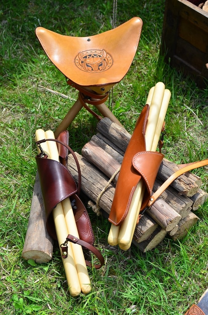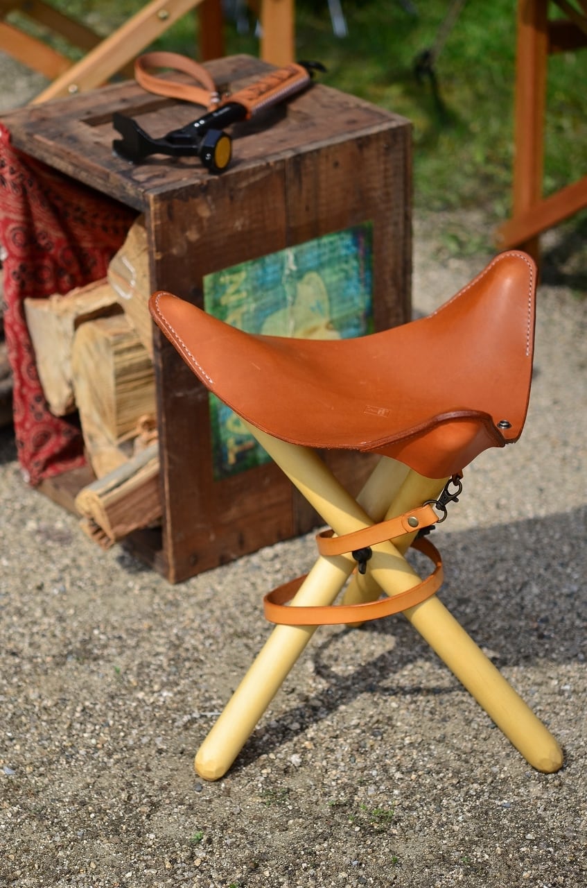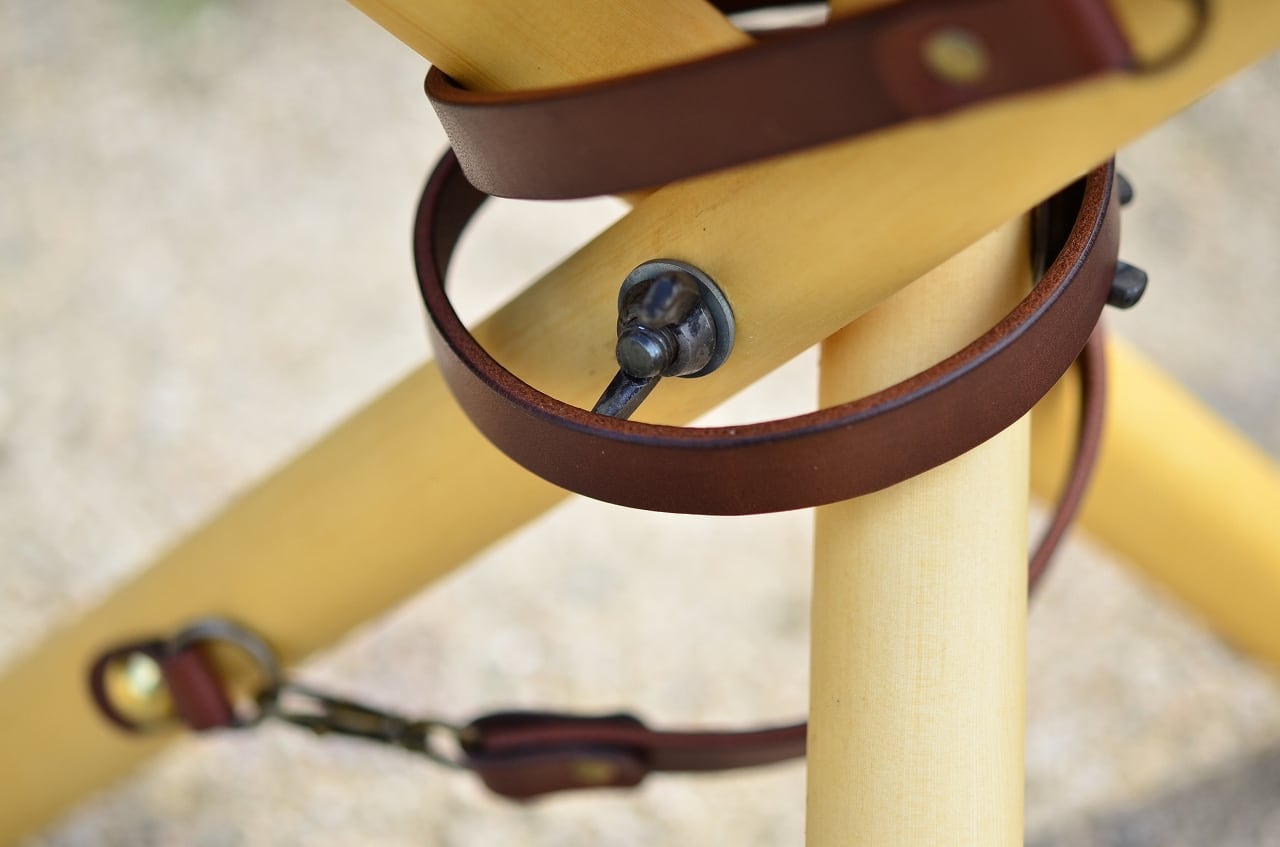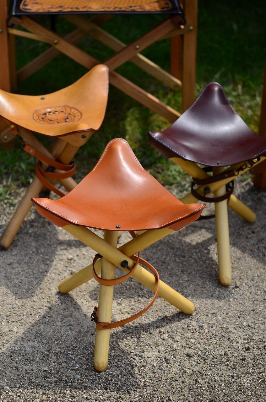 3本の丸木を手作りの専用金具を用いて三又にひらき、革を張ることでチェアに。
