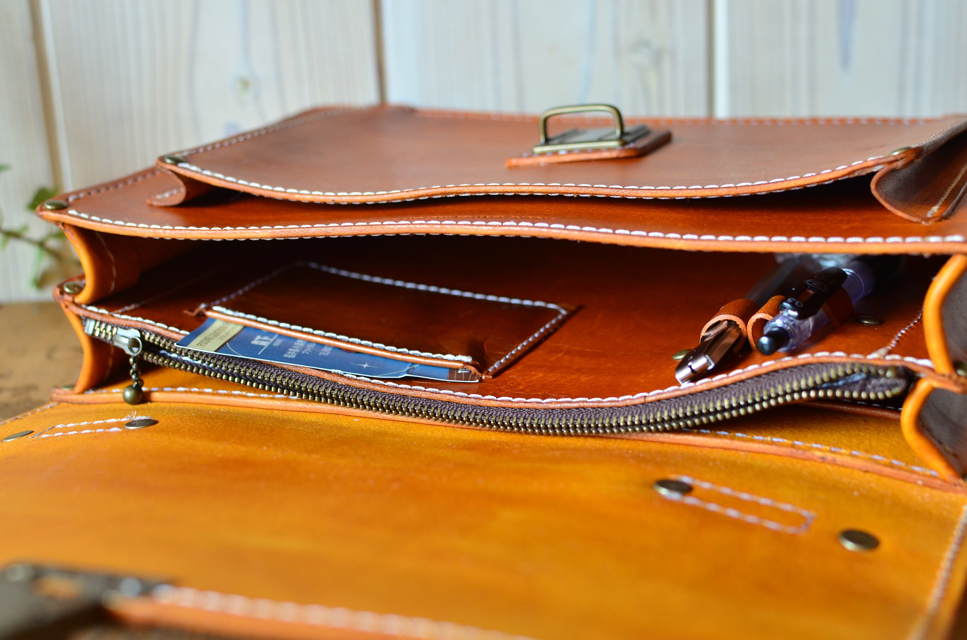シンプルなデザインながら、中のポケットや仕切りに工夫を凝らし